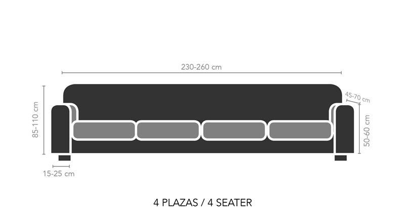 Ελαστικό Κάλυμμα Τετραθέσιου Καναπέ Σύνθεση: 52% Polyester· 42% Cotton · 6% Elastomer Διάσταση: Μήκος πλάτης 240cm έως 270cm Τοποθετήστε το κάλυμμα πάνω στον καναπέ σας και ισιώστε το αρχίζοντας από τις επάνω γωνίες. Βεβαιωθείτε ότι η ετικέτα βρίσκεται εσωτερικώς και δεξιά. Το κάλυμμα είναι ραμμένο έτσι ώστε να είναι σταθερό και να εφαρμόζει στο καναπέ σας. Εάν ο καναπές σας φέρει χωριστά μαξιλάρια,θα πρέπει να τα περάσετε μέσα από το εσωτερικό λάστιχο. Έπειτα μπορείτε να καλύψετε τον υπόλοιπο καναπέ και να "στριμώξετε" το επιπλέον ύφασμα ανάμεσα στις χαραμάδες μεταξύ πλάτης, μπράτσων και μαξιλαριών. Οδηγίες Πλυσίματος: Εως 30 C Μη Χρησιμοποιείτε Λευκαντικό-Στεγνωτήριο-Στεγνό Καθάρισμα.