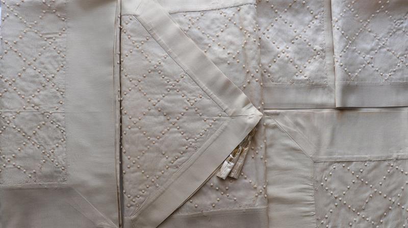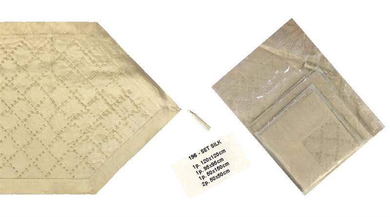 Κέντημα Σετ Ποιότητα:Ταφτάς 100% Μετάξι Περιλαμβάνει: 1 Τραπεζοκαρέ 120X120 1 Καρέ 095X095 1 Τραβέρσα 050X150 2 Πετσετάκια 050X050