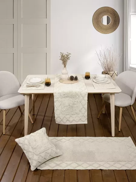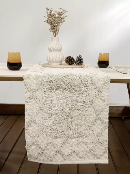 Runner τραπεζαρίας υφαντό, με σύνθεση από 100% cotton. Ένα διαφορετικό runner με στιβαρή ύφανση και ιδιαίτερο σχεδιασμό με ανάγλυφο σχέδιο. Όπως όλα τα βαμβακερά λευκά είδη είναι αντιστατικό και έχει μεγάλη αντοχή στο χρόνο. Λόγω της σταθερής του ύφανσης έχει πολύ καλή εφαρμογή και είναι ιδανικό για να διακοσμήσετε το τραπέζι σας όλες τις εποχές του χρόνου.