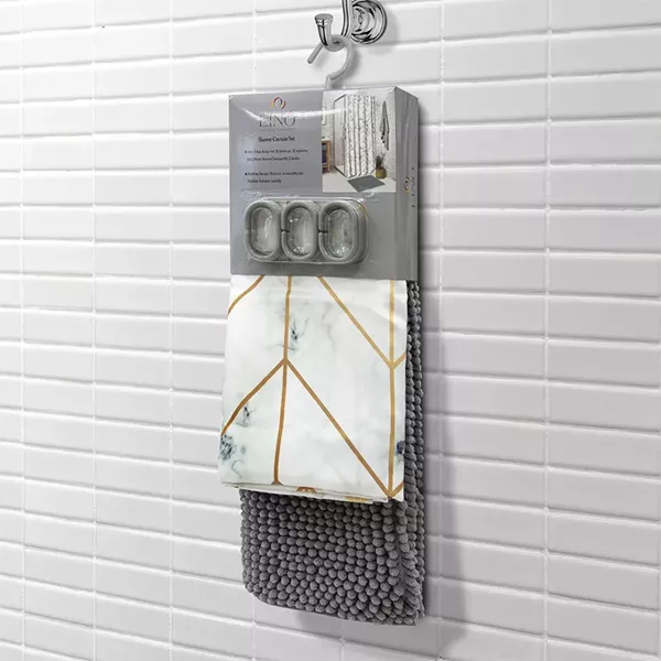 Κουρτίνα μπάνιου Marmor από τη νέα Bath Collection της εταιρείας Lino Home. Η κουρτίνα είναι διακοσμημένη με πρωτότυπο σχέδιο σε ζωηρά χρώματα που θα φωτίσουν και θα δώσουν χαρά σε κάθε μπάνιο. Η νέα συλλογή σε κουρτίνες μπάνιου, παρουσιάζει την ιδιαιτερότητα να έχει κρίκους χρωματικά ταιριαστούς με την κουρτίνα. Η νέα μας συλλογή σε κουρτίνες μπάνιου, είναι κατασκευασμένες από 100% αδιάβροχο πολυεστερικό ύφασμα προκειμένου και να στέκεται όμορφα κρεμασμένη στο χώρο αλλά και να προστατεύει το χώρο από τυχόν νερά που πετάγονται κατά τη διάρκεια του πλυσίματος.