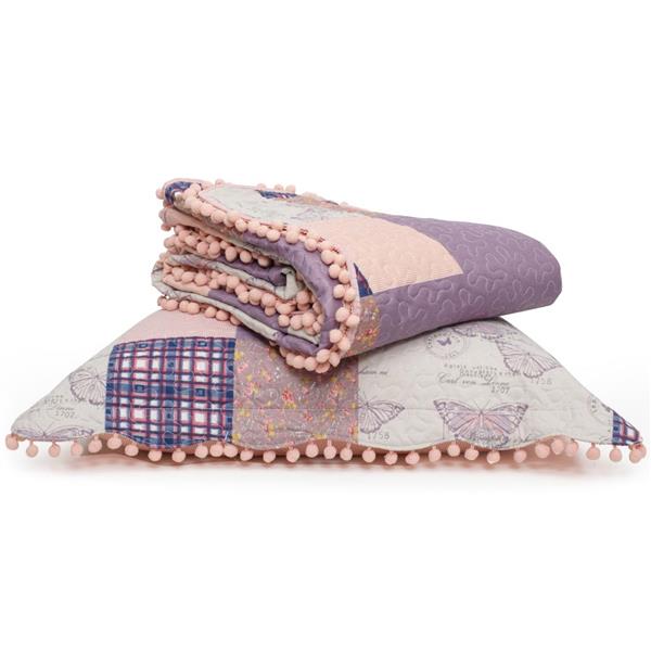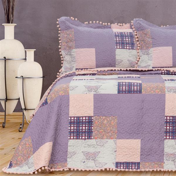 Σετ κουβερλί υπέρδιπλο με μαξιλαροθήκες oxford style από ύφασμα microfiber, 100% πολυέστερ, εμπριμέ, με μοντέρνο σχέδιο, σε λιλά και ροζέ αποχρώσεις, με γραμμικό πολύγαζο σχέδιο και pom pom στην μπροστινή όψη και στις μαξιλαροθήκες.