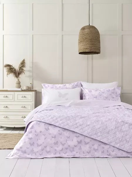 Το κουβερλί betta  αποπνέει μια αέρινη κομψότητα και ρομαντική διάθεση. Αέρινες πεταλούδες, σε διάφορα μεγέθη και σχέδια, "χορεύουν" σε όλη την επιφάνειά του, φέρνοντας τον αέρα της ανοιξιάτικης φρεσκάδας. Οι λιλά αποχρώσεις του σχεδίου, που ανακατεύονται με το λευκό, δημιουργούν μια ατμόσφαιρα γαλήνης και ονειροπόλησης. Στολίστε το κρεβάτι σας με το κουβερλί beta και τα ασορτί βαμβακερά σεντόνια και χαλαρώστε στον ονειρεμένο χώρο που εσείς δημιουργήσατε.