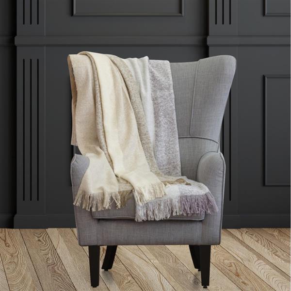 Κουβέρτα καναπέ με κρόσσια, μοχέρ, 100% ακρυλική, σε χρώματα λιλά-γκρί και εκρού-καφέ.
