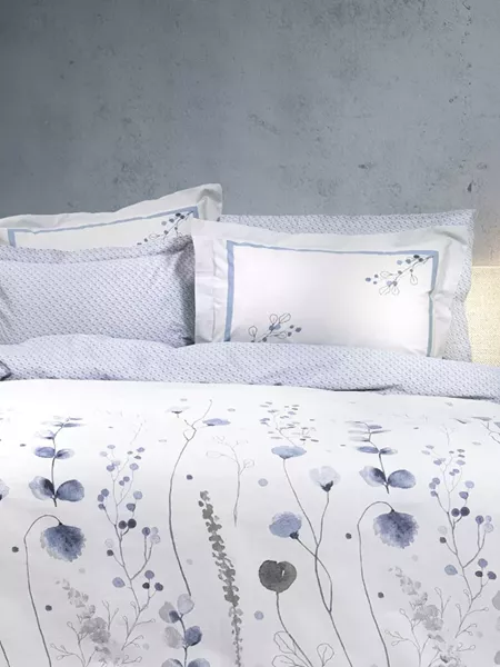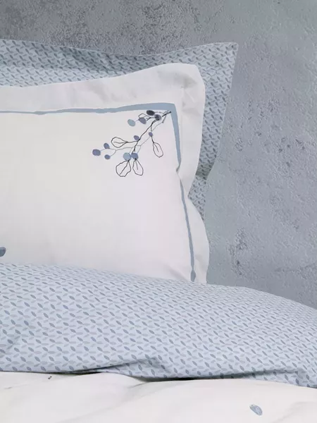 Οι βαμβακερές μαξιλαροθήκες ameya έχουν ένα διακριτικό πάνελ τυπωτό μοτίβο που απεικονίζει κλαδιά με φυλλαράκια και είναι τοποθετημένο στις δύο αντίθετες γωνίες της μαξιλαροθήκης, δημιουργώντας ένα συμμετρικό και καλλιτεχνικό αποτέλεσμα. Το λιτό αυτό σχέδιο πλαισιώνεται με διακριτική μονόχρωμη κορνίζα. Η πίσω όψη τους έχει διακριτικό γεωμετρικό all over μοτίβο σε αποχρώσεις του μπλέ. Η συμμετρικότητα και καθαρή γεωμετρία των μαξιλαροθηκών τονίζεται από την κατασκευή τους, καθώς είναι oxford 4 πλευρών. Οι μαξιλαροθήκες ameya προσφέρουν μια αίσθηση φρεσκάδας και φυσικής ομορφιάς, με ένα σχέδιο που συνδυάζει την απλότητα με την κομψότητα. Είναι η ιδανική επιλογή για να προσθέσετε μια διακριτική, floral πινελιά στον χώρο σας.