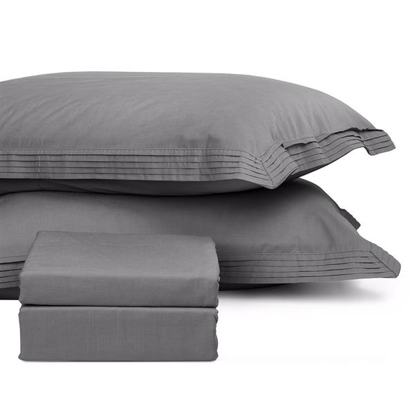 Σετ σεντόνια υπέρδιπλα σε υπέροχα χρώματα και μοναδικό σχέδιο με πιέτα. Το σετ περιλαμβάνει 2 τεμάχια σεντόνια σε διάσταση 230x240 και 2 τεμάχια μαξιλαροθήκες σε διάσταση 50x70. Η ποιότητά του είναι 70% Βαμβάκι - 30% Πολυεστέρα. Κλωστές ανά ίντσα: 150