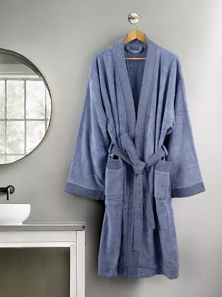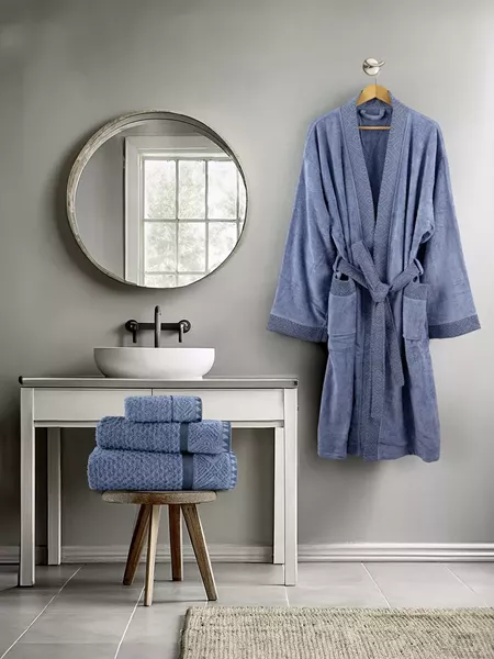 to βαμβακερό μπουρνούζι reiven είναι σχεδιασμένο για να προσδώσει μια νότα δυναμισμού και φινέτσας στο μπάνιο σας. Η βελουτέ επεξεργασία του προσφέρει μια απίστευτη αίσθηση απαλότητας και ζεστασιάς. Τα προσεγμένα τελειώματα με τις υφαντές ζακάρ μπορντούρες με το γεωμετρικό μοτίβο στην πατιλέτα, την ζώνη, τις μανσέτες και το τελείωμα στις τσέπες, αναδεικνύουν την υψηλή ποιότητα κατασκευής του. Το βαθύ και γαλήνιο μπλε χρώμα του, προσθέτει μια μοντέρνα και εκλεπτυσμένη πινελιά. Το μπουρνούζι "reiven" συνδυασμένο με το ασορτί σετ πετσέτες, είναι η ιδανική επιλογή για να μετατρέψετε την καθημερινότητά σας σε μια εμπειρία χαλάρωσης και φινέτσας.