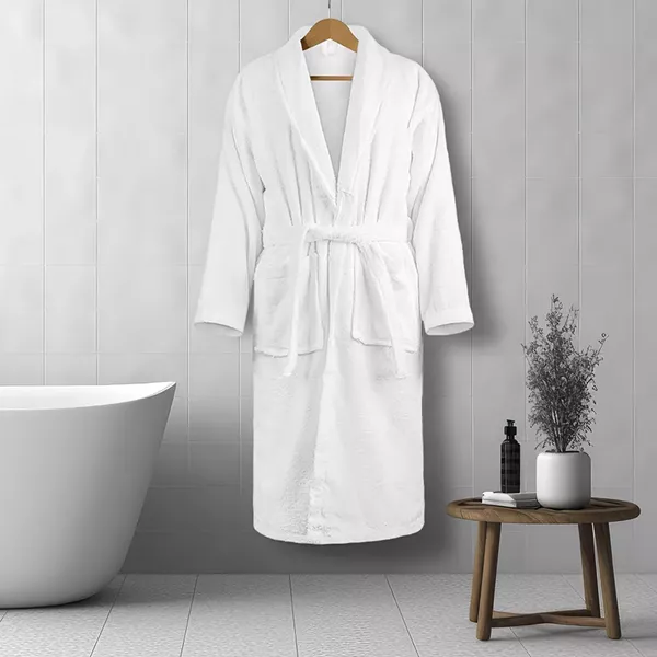 Μπουρνούζι βαμβακερό πετσετέ με γιακά από τη συλλογή του ξενοδοχειακού εξοπλισμού της εταιρείας Lino Home. Είναι λευκό μονόχρωμο με ειδική επεξεργασία των νημάτων για ανθεκτικότητα στα πλυσίματα και το χρόνο.