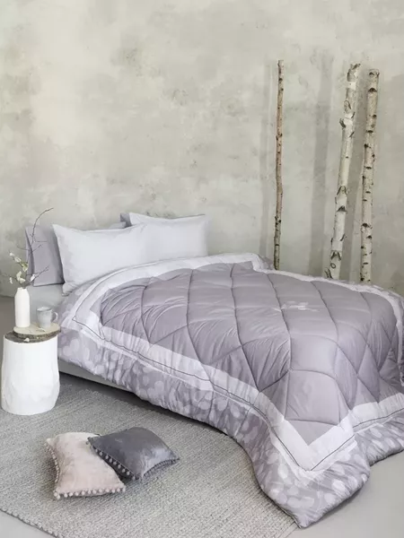 Το πάπλωμα nevena έχει πάνελ σχέδιο, με λιτό floral σχέδιο περιμετρικά, που αποτυπώνει φυλλωσιές και μικρό κεντρικό μοτίβο. Τα χρώματά του σε διαχρονικές  αποχρώσεις του γκρι είναι καταπραϋντικά και ουδέτερα. Εκπροσωπεί την τάση της soft romantic διακόσμησης, που έχει επανέλθει στην κορυφή των προτιμήσεων στην μόδα του σπιτιού. Συνδιάστε το με ίδιο σετ σεντονιών ή και μονόχρωμα δίνοντας μια πινελιά ρομαντισμού στον χώρο.