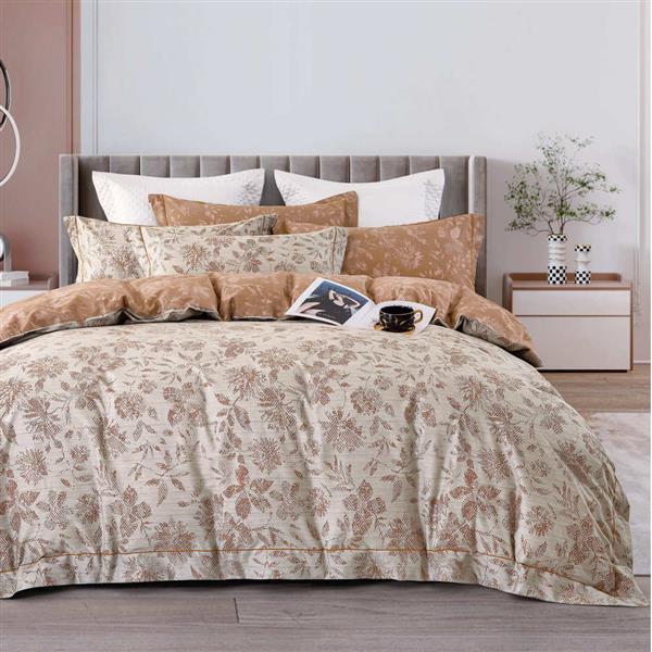 Σετ παπλωματοθήκη με φερμουάρ υπέρδιπλη με μαξιλαροθήκες oxford style από ύφασμα βαμβακοσατέν, 205 κλωστών, 100% βαμβακερό, εμπριμέ, με φλοράλ μοτίβο, σε χρώμα μπεζ, με διακοσμητική φάσα και κέντημα στην μπροστινή όψη και στις μαξιλαροθήκες.