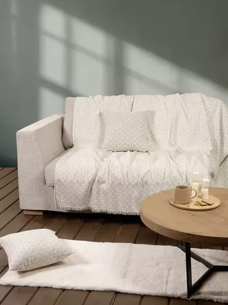 to ριχτάρι roselle ivory έχει ένα όμορφο και διακριτικό σχέδιο σε εκρού χρώμα, που συνδυάζεται εύκολα και δίνει μια αίσθηση ηρεμίας και χαλάρωσης. Έχει minimal γεωμετρικό μοτίβο στο μεγαλύτερο μέρος της επιφάνειάς του, ενώ το τελείωμά του διακοσμεί μια όμορφη φάσα με πυκνό γεωμετρικό μοτίβο. Οι λεπτομέρειες με τα κρόσσια στις άκρες του ριχταριού προσδίδουν μια επιπλέον πινελιά κομψότητας και ανεπιτήδευτης γοητείας. Το ριχτάρι αυτό δεν είναι μόνο πρακτικό για την προστασία των επίπλων σας, αλλά και ένα κομμάτι που θα αναβαθμίσει την αισθητική του χώρου σας. Συνδυάστε το με τα ασορτί διακοσμητικά μαξιλάρια για ένα ολοκληρωμένο και εντυπωσιακό αποτέλεσμα.