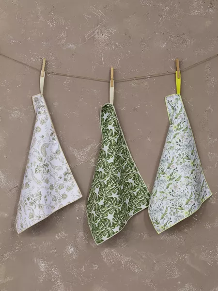 Οι πετσέτες κουζίνας idira είναι διπλής όψης. Μονόχρωμες από την μία πλευρά, ενώ από την άλλη έχουν υπέροχα tropical jungle και floral σχέδια με την τεχνική της νερομπογιάς που κάνουν κάθε πετσέτα να μοιάζει με ένα ξεχωριστό έργο τέχνης. Είναι σε αποχρώσεις του πράσινου και του μπεζ σε πολύχρωμο μοτίβο. Διαθέτουν μια πρακτική θηλιά που κρατά την κάθε πετσέτα σταθερή όταν διπλώνει και μπορεί να χρησιμοποιηθεί και για να την κρεμάσετε όπου σας εξυπηρετεί.  Ένα διαφορετικό και ποιοτικό σετ πετσέτες κουζίνας που  φέρνει τα χρώματα της φύσης μέσα στον χώρο.