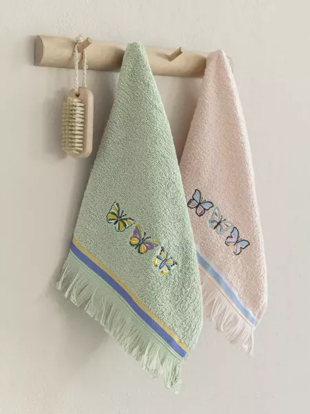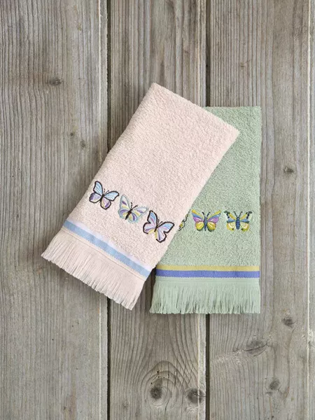 Το σετ πετσέτες χεριών midsummer αποτελείται από δύο πετσετάκια σε αποχρώσεις της μέντας και του γήινου ροζ, που είναι διακοσμημένα με πανέμορφο κέντημα με πολύχρωμες πεταλούδες. Το τελείωμά τους με γραμμική μπορντούρα και διακριτικά κρόσια προσθέτει μια επιπλέον υφή και που τα κάνει ακόμα πιο ξεχωριστά. Έχουν τόσο χρηστικό όσο και διακοσμητικό ρόλο και θα σας μεταφέρουν ανοιξιάτικα vibes. Ένα ξεχωριστό σετ για το μπάνιο σας ή για δώρο στα αγαπημένα σας πρόσωπα.