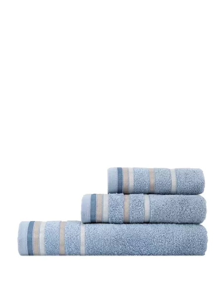 Οι βαμβακερές πετσέτες embrace blue έχουν πυκνή ύφανση και είναι ιδιαίτερα απορροφητικές, αφήνοντας την επιδερμίδα σας στεγνή και απαλή μετά από το μπάνιο ή το ντούς, Το μοντέρνο μπλε χρώμα τους είναι μια σύγχρονη επιλογή που θα "φωτίσει" το μπάνιο σας, ενώ ο κομψός σχεδιασμός τους, με την χρωματιστή γραμμική μπορντούρα στο τελείωμα, δίνει ζωντάνια και μια πινελιά φινέτσας. Είναι ένα σετ που θα ξεχωρίσει για την λιτή αισθητική και την ποιότητά του, ενώ ταυτόχρονα είναι πρακτικές και ιδανικές για την καθημερινότητά σας. Προσφέρεται σε σετ τριών τεμαχίων που περιλαμβάνει μία πετσέτα μπάνιου μια προσώπου και μια χεριών, δεμένες με μια κομψή κορδέλα, ώστε να μπορείτε να τις δωρίσετε σε αγαπημένα σας προσωπα.