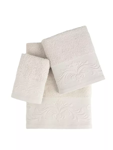 Το βαμβακερό σετ πετσέτας ambrose l. beige έχει σώμα με υπέροχη αφράτη υφή σε εκρού χρώμα. Στολίζεται από εκλεπτυσμένη ζακάρ μπορντούρα με floral μοτίβο που προσδίδει μια αίσθηση φυσικής κομψότητας και καλλιτεχνικής φινέτσας στις πετσέτες. Η λεπτομέρεια της μπορντούρας τονίζει την υψηλή ποιότητα κατασκευής και την προσοχή στη λεπτομέρεια. aποτελούν μια εξαιρετική επιλογή για εσάς που αγαπάτε την minimal αισθητική και τις ουδέτερες αποχρώσεις και εναρμονίζονται με κάθε στυλ διακόσμησης. Η συσκευασία τους είναι όμορφη και λιτή, με μια διακριτική κορδέλα, ώστε να την προσφέρετε σαν δωράκι σε αγαπημένους σας φίλους.