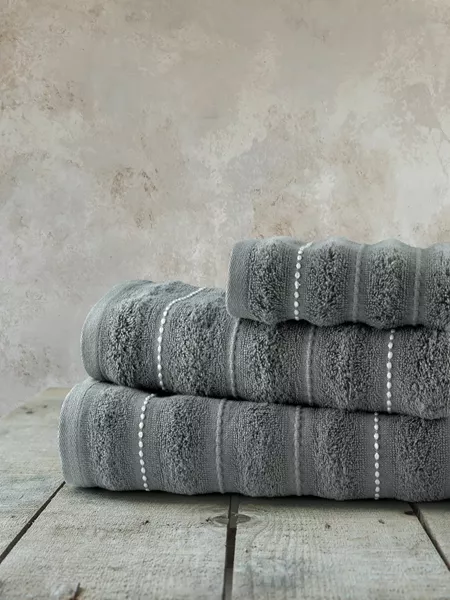 Το βαμβακερό σετ πετσέτες aura dark gray έχει σκούρο γκρι χρώμα που δίνει έναν έντονο χαρακτήρα στην πετσέτα, χαρίζοντας στο μπάνιο σας μια αίσθηση δυναμισμού. Το υφαντό jacquard σχέδιό της, με ανάγλυφες ρίγες που διατρέχουν όλη την πετσέτα, δημιουργεί μια κομψή και διαχρονική υφή, ενώ τα τμήματα με πιο πλούσιο και παχύ πέλος προσθέτουν βάθος και ιδιαίτερη απαλότητα στην αφή. Φρεσκάδα, δυναμισμός και διακριτική πολυτέλεια συναντιούνται στην πετσέτα aura dark gray. Κάθε λεπτομέρειά της είναι σχεδιασμένη ώστε να προσφέρει όχι μόνο πρακτικότητα, αλλά και αισθητική αρμονία.