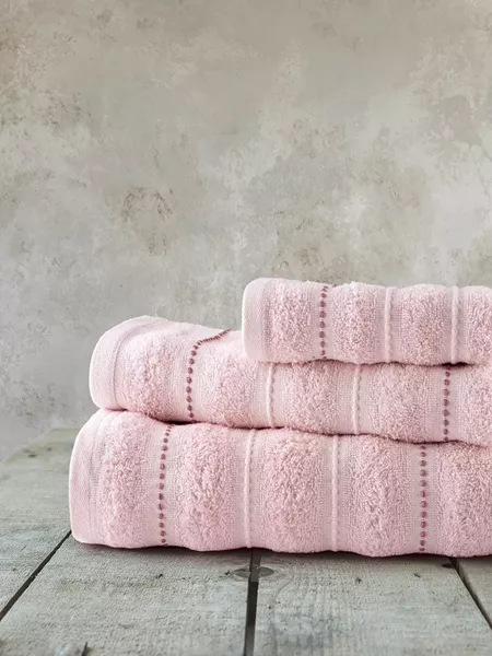 Το βαμβακερό σετ πετσέτες aura pink έχει απαλό ροζ χρώμα και αποπνέει ηρεμία και αίσθηση ρομαντισμού. Το υφαντό jacquard σχέδιό της, με ανάγλυφες ρίγες που διατρέχουν όλη την πετσέτα, δημιουργεί μια κομψή και διαχρονική υφή, ενώ τα τμήματα με πιο πλούσιο και παχύ πέλος προσθέτουν βάθος και ιδιαίτερη απαλότητα στην αφή. Φρεσκάδα, ρομαντισμός και διακριτική πολυτέλεια συναντιούνται στην πετσέτα aura pink. Κάθε λεπτομέρειά της είναι σχεδιασμένη ώστε να προσφέρει όχι μόνο πρακτικότητα, αλλά και αισθητική αρμονία.
