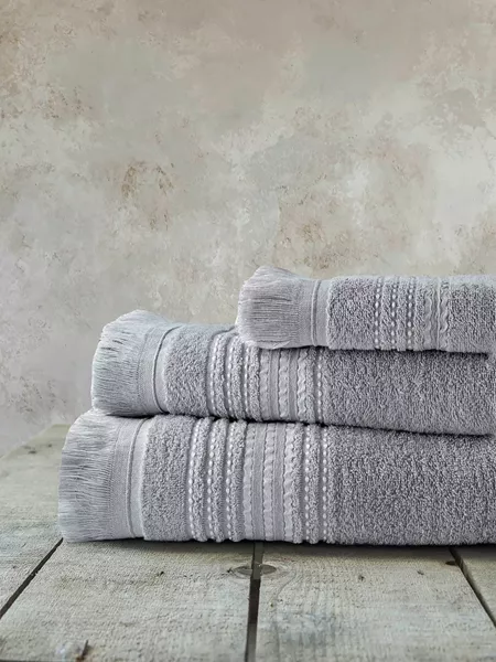 Οι βαμβακερές πετσέτες allora gray έχουν πλούσια υφή και μοντέρνο διαχρονικό γκρι χρώμα.Το τελείωμα της κάθε πετσέτας στολίζεται με γραμμικά σιρίτια σε χρωματική αρμονία με την βάση της, ενώ διακριτικά κρόσσια της δίνουν μια έξτρα κίνηση και εκλεπτυσμένη όψη. Θα ξεχωρίσουν για την λιτή αισθητική και την ποιότητά τους. Προσφέρονται μεμονωμένες και σε σετ τριών τεμαχίων που περιλαμβάνει μία πετσέτα μπάνιου μια προσώπου και μια χεριών. Αναβαθμίστε την εμπειρία του μπάνιου σας με την πετσέτα "allora", η οποία συνδυάζει την απαλότητα με ένα μοντέρνο και διακριτικό σχέδιο. Ιδανική για όσους αναζητούν την κομψότητα στην απλότητα.