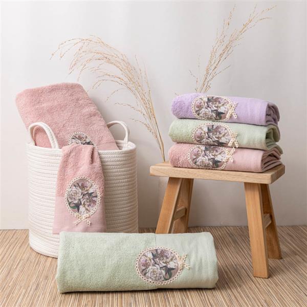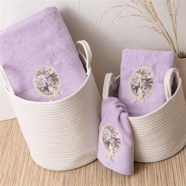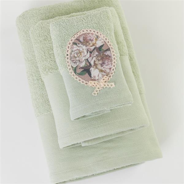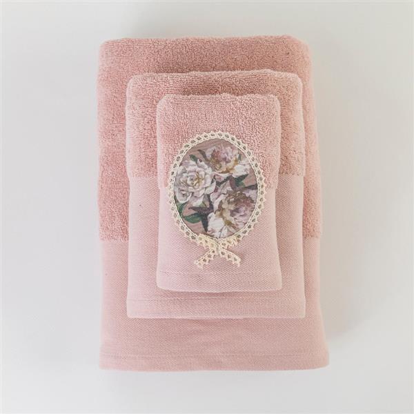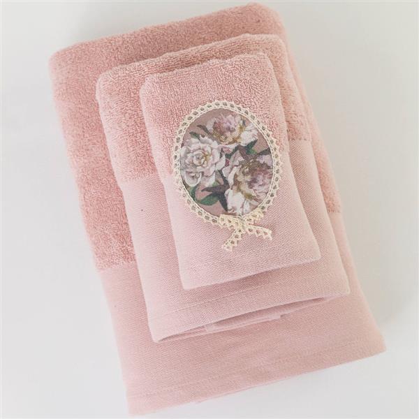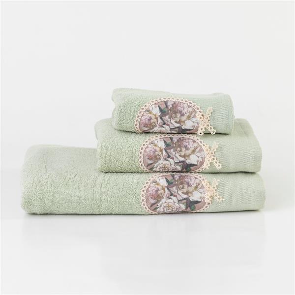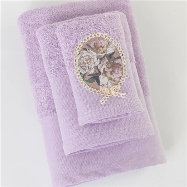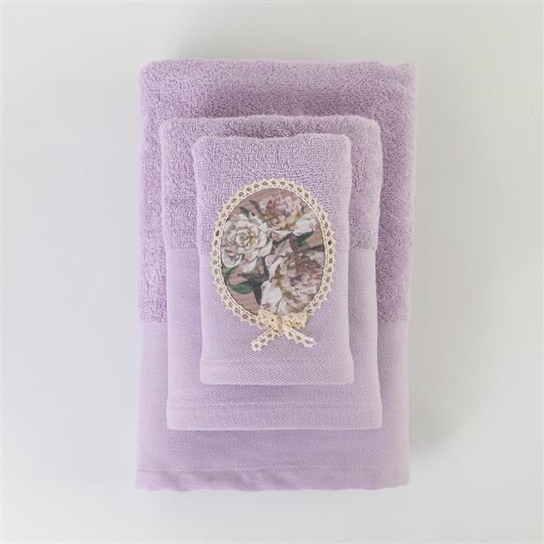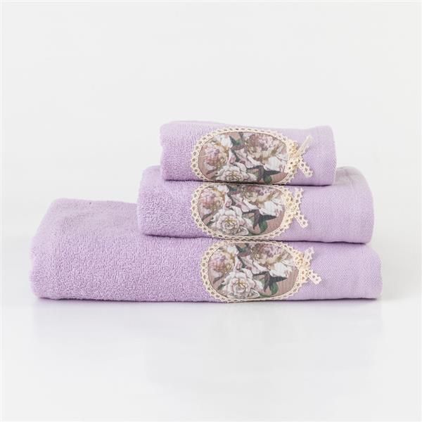 Σετ πετσέτες 3 τεμαχίων, μπάνιου, προσώπου και χειρός, από ύφασμα φροτέ, πενιέ, 100% βαμβακερό, με διακοσμητική βαμβακερή δαντέλα και απλικέ. Διατίθεται σε 3 χρώματα.