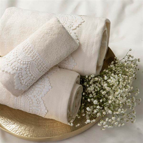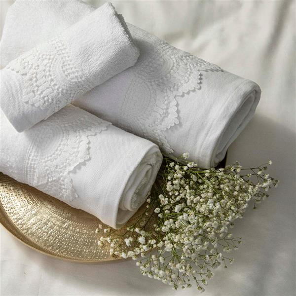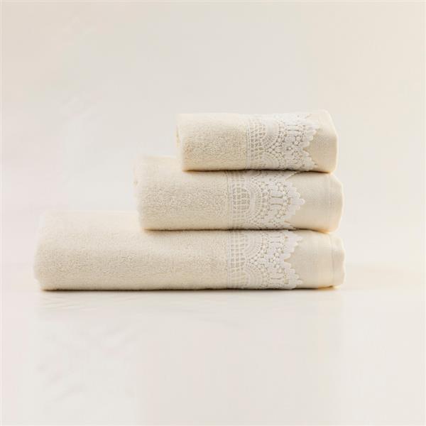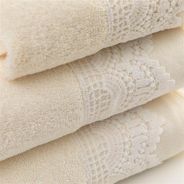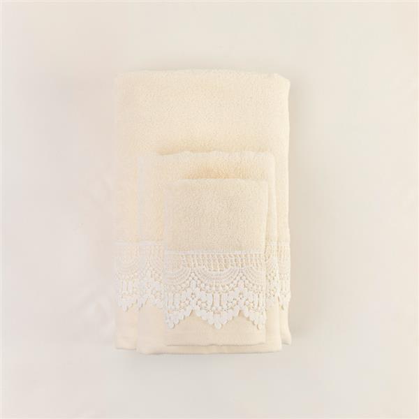 Σετ πετσέτες 3 τεμαχίων, μπάνιου, προσώπου και χειρός, από ύφασμα φροτέ, πενιέ, 100% βαμβακερό, με διακοσμητική δαντέλα. Διατίθεται σε 2 χρώματα.