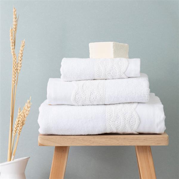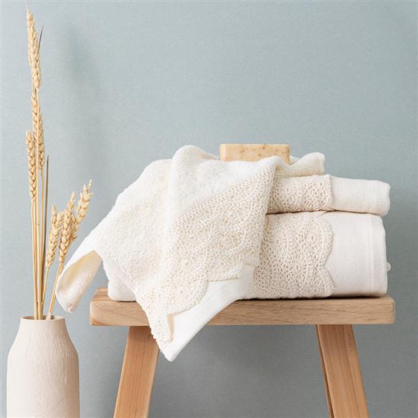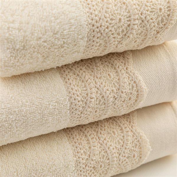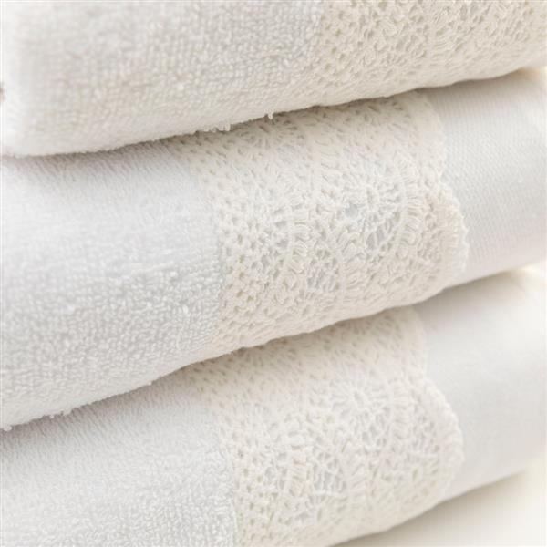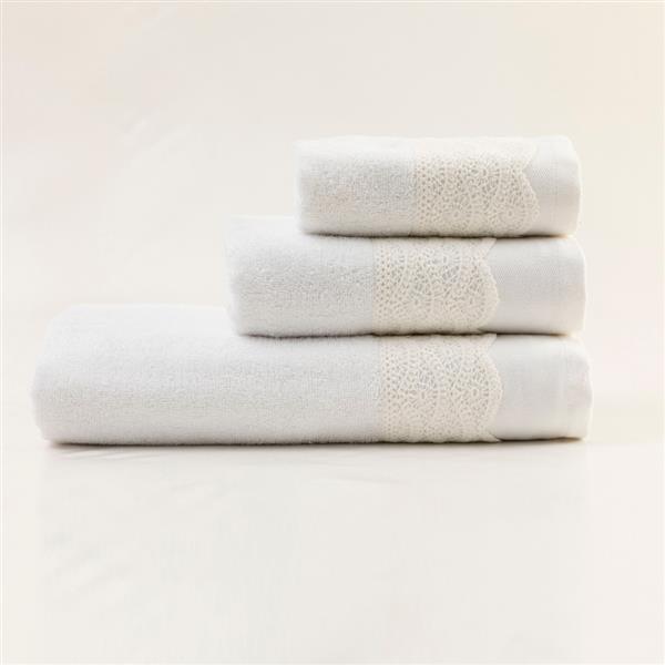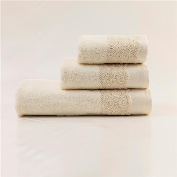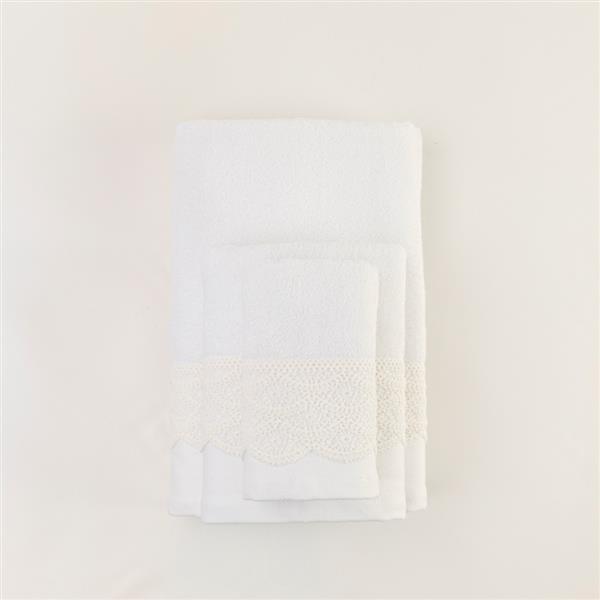 Σετ πετσέτες 3 τεμαχίων, μπάνιου, προσώπου και χειρός, από ύφασμα φροτέ, πενιέ, 100% βαμβακερό, με διακοσμητική δαντέλα. Διατίθεται σε 2 χρώματα.
