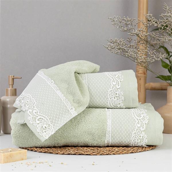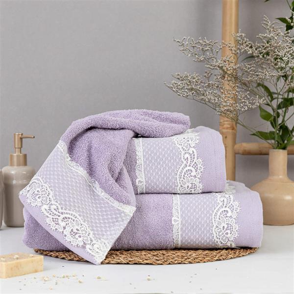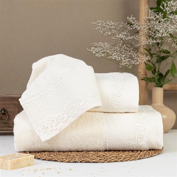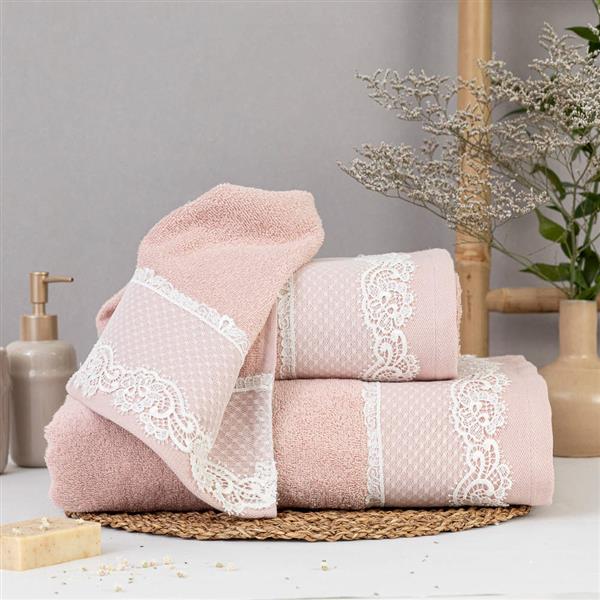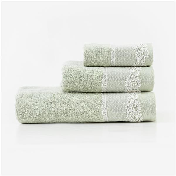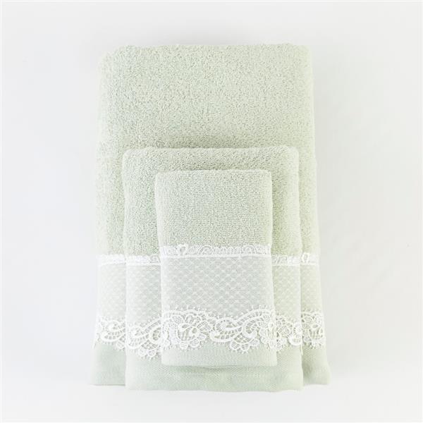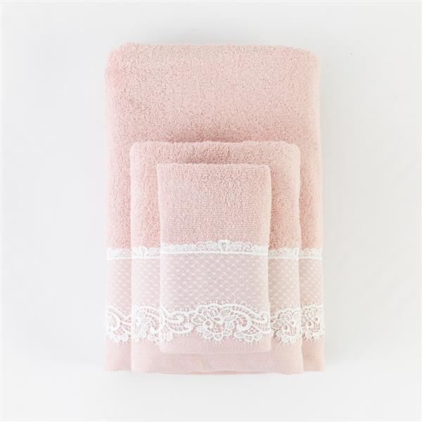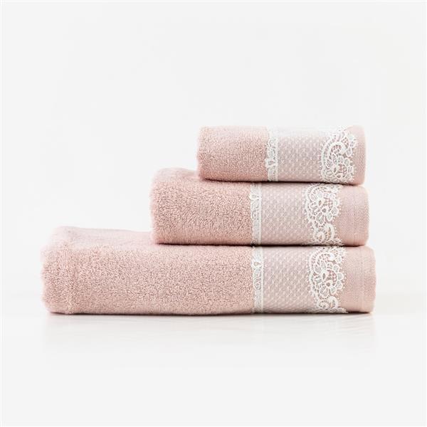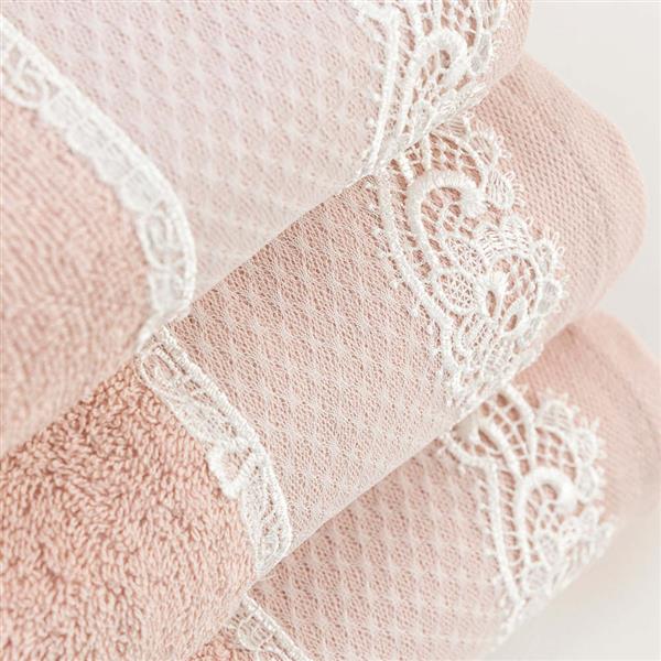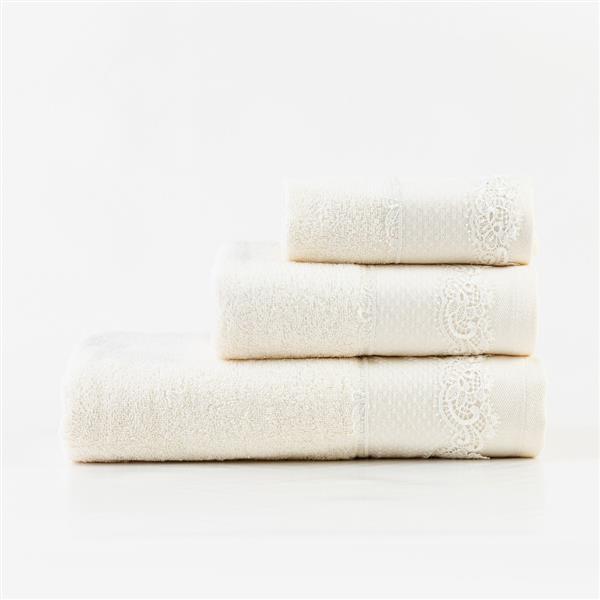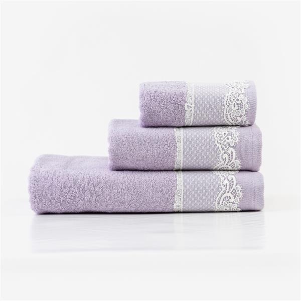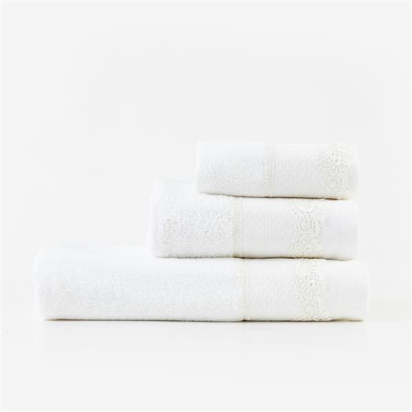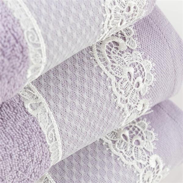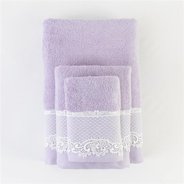 Σετ πετσέτες 3 τεμαχίων, μπάνιου, προσώπου και χειρός, από ύφασμα φροτέ, πενιέ, 100% βαμβακερό, με διακοσμητική δαντέλα. Διατίθεται σε 5 χρώματα.