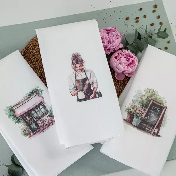 Σετ από 3 ποτηρόπανα κουζίνας polycotton, 50% βαμβακερό-50% πολυέστερ, λευκό με ψηφιακή εκτύπωση σε κουτί συσκευασίας δώρου. Για σκούπισμα των πιάτων χωρίς χνούδι.