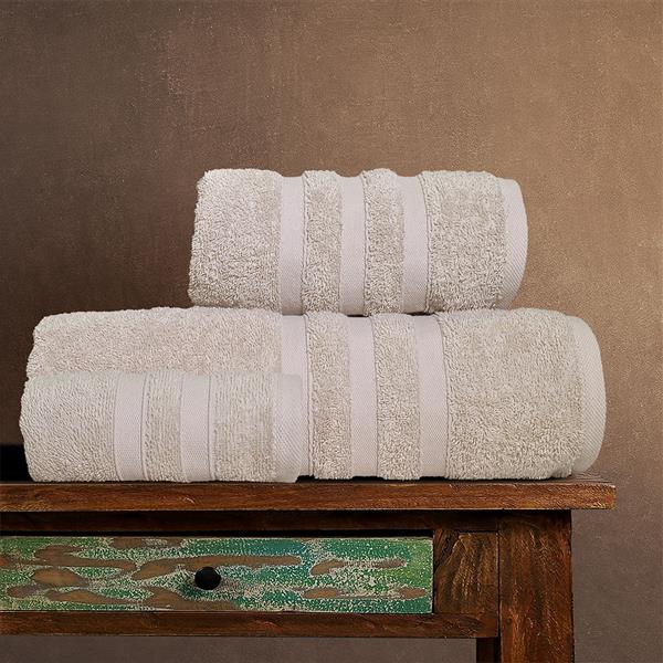 Το σετ αποτελείται από τρεις πετσέτες, μία χεριών, μία προσώπου και μία μπάνιου.