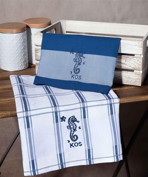 Σετ 2 τεμαχίων ποτηρόπανα (50cm x 70cm) μπλέ ιππόκαμπος KOS