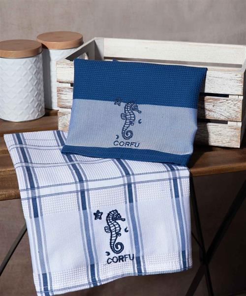 Σετ 2 τεμαχίων ποτηρόπανα (50cm x 70cm) μπλέ ιππόκαμπος CORFU