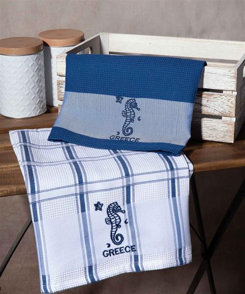 Σετ 2 τεμαχίων ποτηρόπανα (50cm x 70cm) μπλέ ιππόκαμπος GREECE