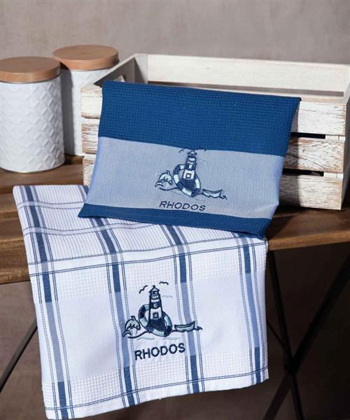 Σετ 2 τεμαχίων ποτηρόπανα (50cm x 70cm) μπλέ φάρος RHODES