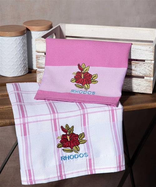 Σετ 2 τεμαχίων ποτηρόπανα (50cm x 70cm) ρόζ λουλούδι RHODES