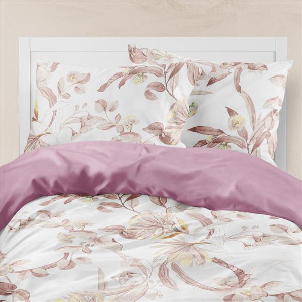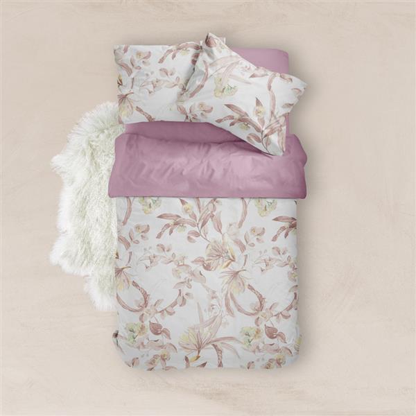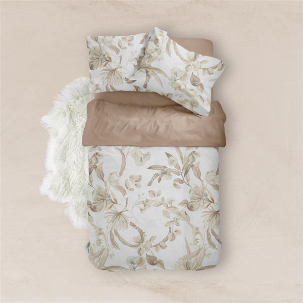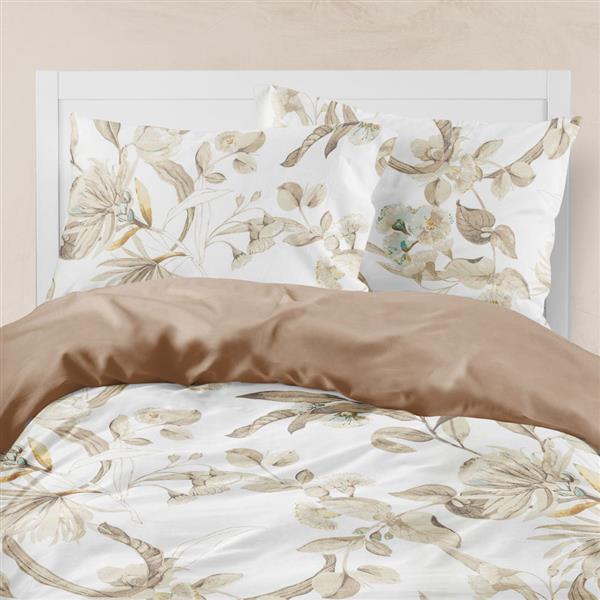 Σετ σεντόνια υπέρδιπλα με μαξιλαροθήκες από ύφασμα μερσεριζέ, 160 κλωστών, 100% βαμβακερό, συνδυασμός εμπριμέ φλοράλ μοτίβου και μονοχρωμίας, χρώμα καφέ σε λευκό φόντο.
