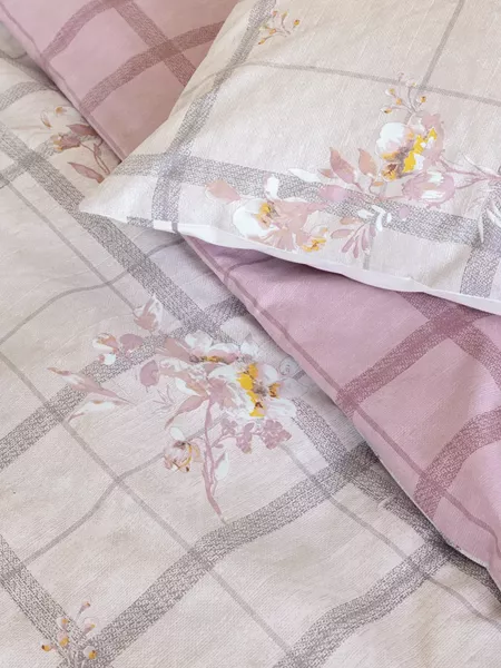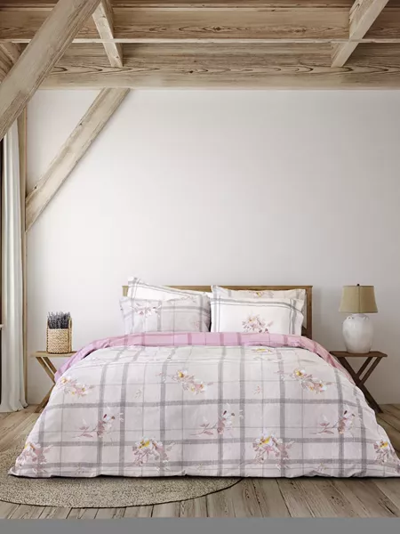 Τα βαμβακερά σεντόνια reimon έχουν καρό σχέδιο σε ροζ και απαλές μωβ αποχρώσεις, εμπλουτισμένο με όμορφα λουλούδια σε ροζ και κίτρινο χρώμα που προσθέτουν μια κομψή και ρομαντική αίσθηση. Οι μαξιλαροθήκες έχουν πάνελ σχέδιο στην μια τους όψη, όπου κυριαρχεί το όμορφο μπουκέτο λουλουδιών πάνω σε λευκό φόντο, ενώ η δεύτερη όψη τους είναι ίδια με το πανωσέντονο ώστε να έχετε την δυνατότητα επιλογής στρωσίματος. Το σετ έχει ένα κλασικό και ταυτόχρονα μοντέρνο ύφος που μπορεί να ταιριάξει σε διάφορα διακοσμητικά στυλ υπνοδωματίου.