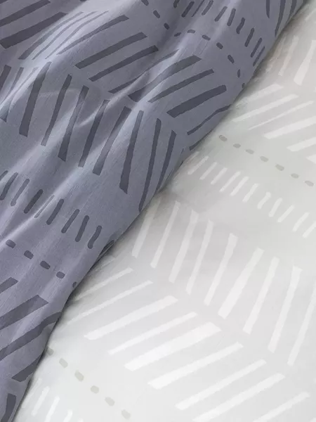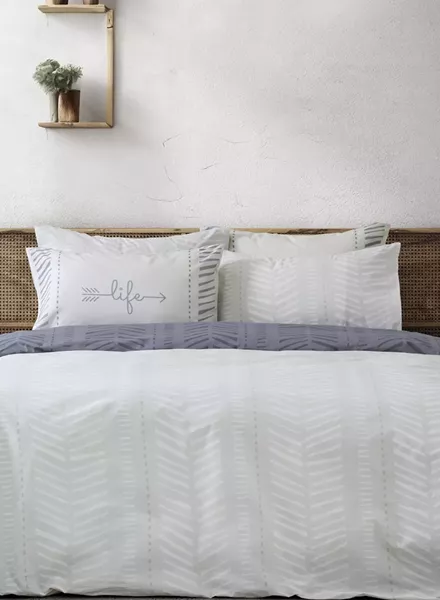 Τα βαμβακερά σεντόνια leklair ξεχωρίζουν για τον μινιμαλιστικό και σύγχρονο σχεδιασμό τους. Έχουν διακριτικό γεωμετρικό σχέδιο, με επαναλαμβανόμενες λεπτές γραμμές σε σχήμα ψαροκόκαλου ή chevron, που δημιουργούν ένα ήπιο και ενδιαφέρον οπτικό αποτέλεσμα. Η χρωματική παλέτα του πανωσέντωνου αποτελείται από δύο βασικά χρώματα, το λευκό και το γκρι δημιουργώντας μια αίσθηση καθαριότητας και φωτεινότητας, ενώ στο κατωσέντονο έχουμε δύο διαφορετικούς τόνους του γκρι. Οι μαξιλαροθήκες είναι τύπου "πανελ" με κεντρικό μοτίβο το μήνυμα "life" και το διακριτικό σχέδιο ψαροκόκαλου να το πλαισιώνει. Τα σετ σεντονιών leklair με τον απλό αλλά ταυτόχρονα μοντέρνο σχεδιασμό τους, ταιριάζουν με πολλά διαφορετικά στυλ διακόσμησης και προσδίδουν μια μοντέρνα και κομψή πινελιά στον χώρο. Συνδυάστε τα με το ασορτί κουβερλί για ένα άψογο και ολοκληρωμένο αισθητικό αποτέλεσμα!