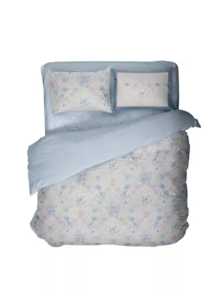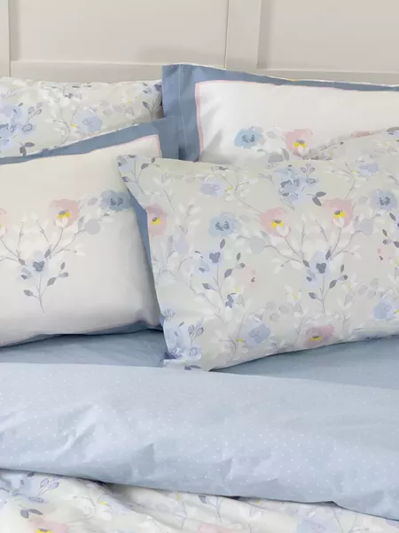 Τα βαμβακερά σεντόνια idylle έχουν floral μοτίβο με άνθη σε ζωγραφική απεικόνιση, αποπνέοντας μια αίσθηση φρεσκάδας και ελαφρότητας. Ωστόσο, η διάταξη των λουλουδιών ακολουθεί μια πιο γεωμετρική λογική, με επαναλαμβανόμενα μοτίβα και συμμετρία, προσδίδοντας μια μοντέρνα και οργανωμένη εμφάνιση. Η χρωματική τους παλέτα κινείται σε παστέλ αποχρώσεις του γαλάζιου, του ροζ και του κίτρινου, που συνδυάζονται αρμονικά μεταξύ τους πάνω σε μια μπεζ βάση. Οι μαξιλαροθήκες του σετ είναι τύπου "πανελ", με ένα μπλε πλαίσιο περιμετρικά και ένα κεντρικό μοτίβο με λουλούδια. Ο κομψός σχεδιασμός τους αλλά και ο χρωματικός τόνος της μπλε μπορντούρας, κάνουν τις μαξιλαροθήκες να έχουν πρωταγωνιστική θέση στο στρώσιμο του κρεβατιού. Το σετ σεντονιών idylle ξεχωρίζει για τον ρομαντικό και ταυτόχρονα σύγχρονο σχεδιασμό του.