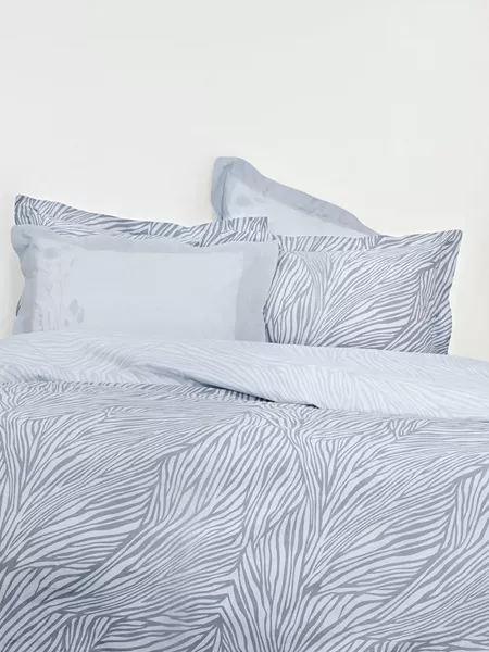 Τα βαμβακερά σεντόνια mocca έχουν σχέδιο εμπνευσμένο από τις γραμμές της ζέβρας, προσδίδοντας έναν δυναμικό χαρακτήρα στον χώρο σας. Ο συνδυασμός του μπλε και του γκρι δημιουργεί μια ατμόσφαιρα ηρεμίας. Το σετ διαθέτει πάνελ μαξιλαροθήκες με λιτό floral σχέδιο που έρχεται σε αντίθεση με τον χαρακτήρα του σχεδίου των σεντονιών. Αυτή η λεπτομέρεια ενισχύει τον μυστηριώδη και εξωτικό χαρακτήρα του σχεδίου. Το συνολικό στυλ του σετ σεντονιών είναι μοντέρνο και minimal, με έμφαση στην απλότητα και στις καθαρές γραμμές. Ταιριάζει ιδανικά σε κρεβατοκάμαρες με αντίστοιχο στυλ διακόσμησης και είναι ιδανικό για όσους επιθυμούν να προσθέσουν μια νότα δυναμισμού και κομψότητας στο χώρο τους.