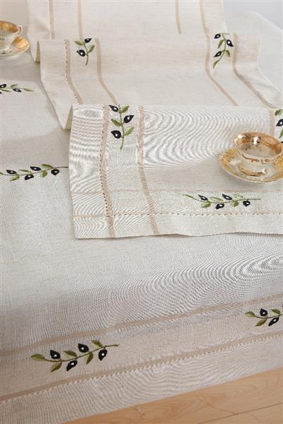 Τραπεζομάντηλα με ελιά και φαρδύ τρυπογάζι, το τραπεζομάντηλο συνοδεύεται από πετσέτες φαγητού.
