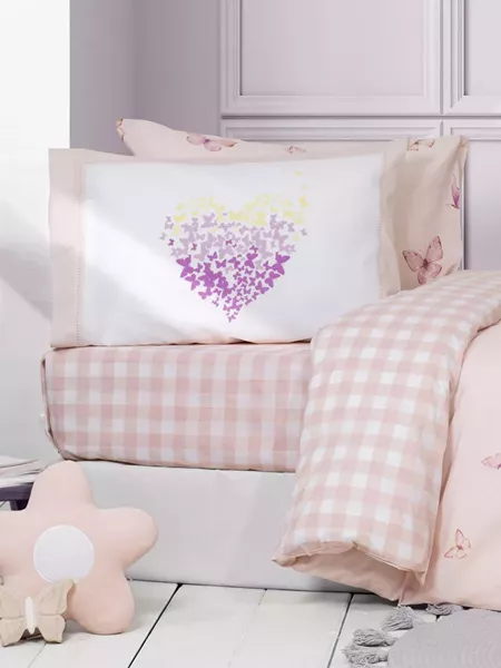 Οι βαμβακερές μαξιλαροθήκες bettina έχουν panel σχέδιο με κεντρικό μοτίβο μια καρδιά που σχηματίζεται από χρωματιστές πεταλούδες και δίνει μια αίσθηση αέρινης φυσικής ομορφιάς  και χαρούμενης διάθεσης. Οι απαλές αποχρώσεις του ροζ του λιλά και του κίτρινου πάνω στο λευκό φόντο δίνουν ένα γλυκό ονειρεμένο αποτέλεσμα. Πλουτίστε το στρώσιμο του παιδικού κρεβατιού με τις extra μαξιλαροθήκες ή συνδιάστε τις με μονόχρωμα σεντόνια για μια πιο minimal διακόσμηση παιδικού δωματίου.Τέλεια ιδέα για δώρο, για γενέθλια, γιορτές ή απλώς για να χαρίσετε χαμόγελα!