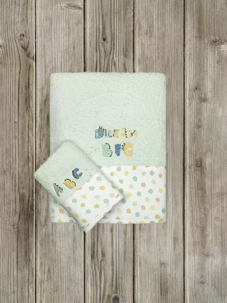 Το βαμβακερό σετ πετσέτες dream big ξεχωρίζει για το γλυκό του μήνυμα "dream big", που είναι κεντημένο με πολύχρωμα, παιχνιδιάρικα γράμματα, γεμάτα φαντασία. Το σχέδιο συμπληρώνεται από μια χαρούμενη μπορντούρα με πολύχρωμα πουά, ενώ το μικρότερο πετσετάκι έχει ένα όμορφο κεντημένο σχέδιο που ταιριάζει με τη συνολική του εμφάνιση. Το γαλήνιο ανοιχτό πράσινο χρώμα των πετσετών δημιουργεί μια αίσθηση ηρεμίας και φρεσκάδας. Μετατρέψτε την ώρα του μπάνιου σε μια διασκεδαστική και ονειρεμένη εμπειρία με το παιδικό σετ πετσετών "dream big", που είναι σχεδιασμένο για να προσφέρει την απόλυτη απαλότητα και άνεση. Είναι το τέλειο δώρο που προσκαλεί τα παιδιά να ονειρεύονται!