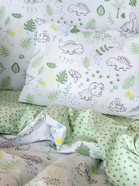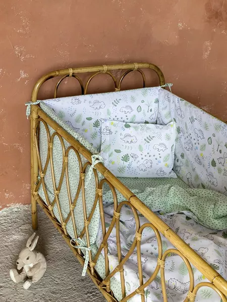 to κουβερλί baby t- rex φέρνει στο βρεφικό δωμάτιο εικόνες παραμυθιού με όμορφο τυπωτό σχέδιο με δεινοσαυράκια. Το λευκό του φόντο και το πράσινο χρώμα που υπερισχύει στις φιγούρες δίνει μια ηρεμία στο σύνολο. Είναι ιδανική επιλογή για τα μικρά αγοράκια, καθώς οι οι παραμυθένιες φιγούρες με τα δεινοσαυράκια θα κεντρίσουν την φαντασία τους και θα τους δώσουν χαρά. Η δεύτερη όψη του κουβερλί με το ανοικτό πράσινο φόντο και το λιτό γεωμετρικό μοτίβο, είναι επίσης μια δεύτερη επιλογή που δίνει μια ήπια αντίθεση, ενισχύει το χρώμα και φέρνει ηρεμία στο σύνολο. Συνδυάστε το με ασορτί πάντα σεντονάκια και κουνουπιέρα για παραμυθένιο αέρα στο βρεφικό δωμάτιο.