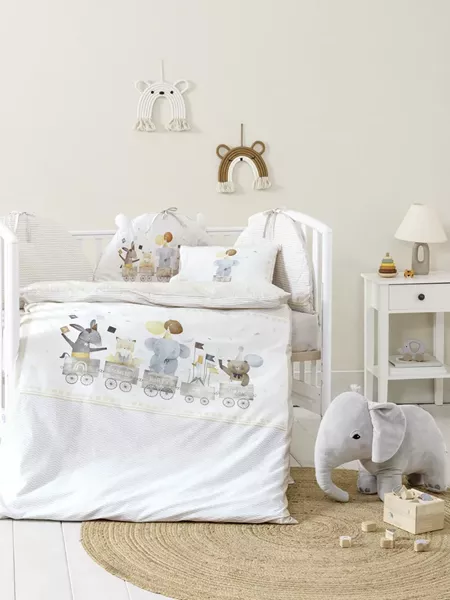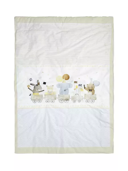 to κουβερλί κούνιας magic party έχει ένα παιχνιδιάρικο σχέδιο με χαριτωμένα ζωάκια να ταξιδεύουν χαρούμενα, κάνοντας πάρτυ πάνω σε ένα τρενάκι. Τα απαλά χρώματα, όπως λευκό, μπεζ, γκρι γαλάζιο και κίτρινο, αναδεικνύουν το σχέδιο, προσδίδουν μια αίσθηση ηρεμίας και γαλήνης και δημιουργούν ένα γλυκό και χαλαρωτικό αποτέλεσμα. Ντύστε την κούνια του μωρού σας με όποιο από τα προϊόντα της σειράς magic party επιλέξετε και μεταδώστε στο μωρό σας μια χαρούμενη και χαλαρωτική διάθεση.