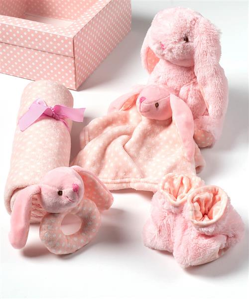Κουτί δώρου το οποίο περιλαμβάνει κουβερτάκι 75cm x 75cm ένα κουκλάκι, παπουτσάκια, κουδουνίστρα και νάνι