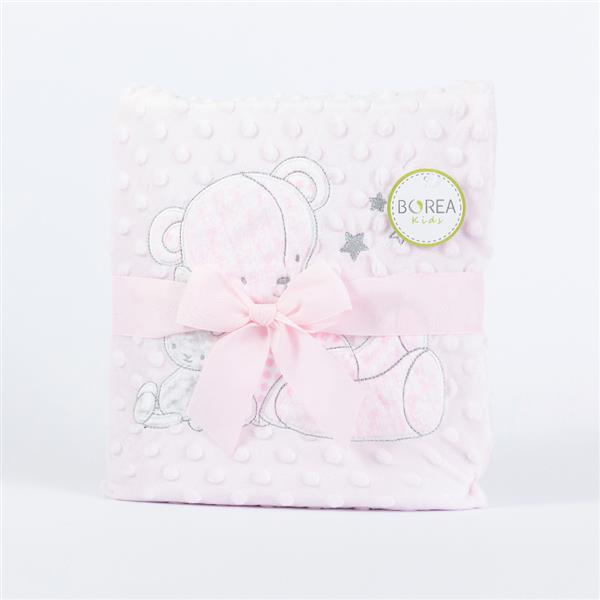 Κουβέρτα κούνιας από ύφασμα micromink, μονόχρωμο, ανάγλυφο, με φούσκες, κέντημα και διακοσμητική φάσα περιμετρικά στην μπροστινή όψη από ύφασμα εμπριμέ,jersey ίδιο με την πίσω όψη, 100% πολυέστερ. Διατίθεται σε 2 χρώματα.