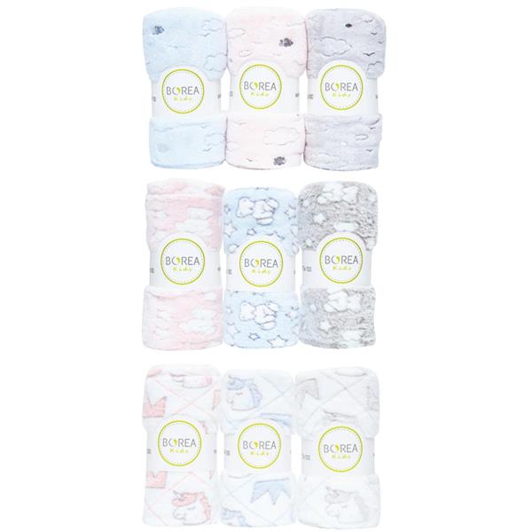 Εννέα κουβερτάκια αγκαλιάς από ύφασμα φλανελ, 100% πολυέστερ, σε 3 σχέδια και 3 χρώματα σε κουτί προώθησης.