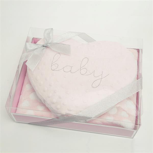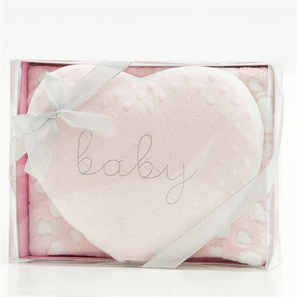 Σετ κουβέρτα αγκαλιάς από ύφασμα φλάνελ και μαξιλάρι φιγούρας από ύφασμα micromink, μονόχρωμο, ανάγλυφο, με φούσκες και κέντημα, 100% πολυέστερ, σχέδιο καρδούλα, σε κουτί.