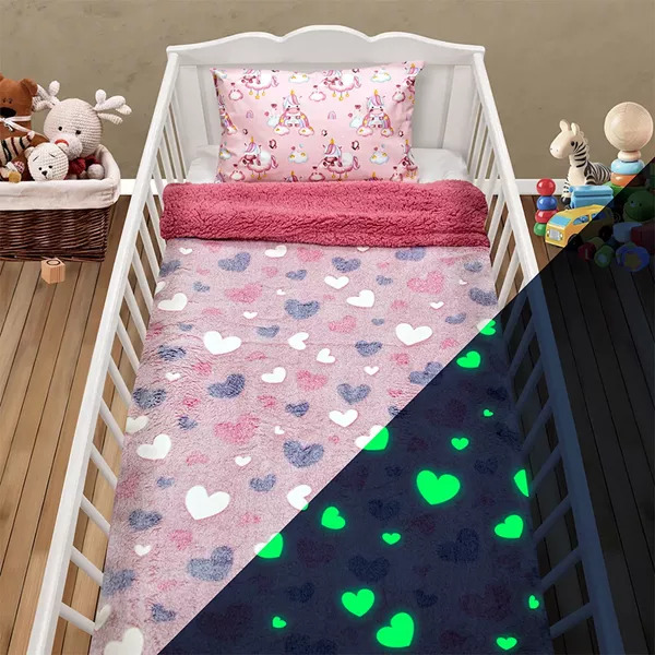 Ανακαλύψτε την απόλυτη προσθήκη στο παιδικό δωμάτιο με την κουβέρτα Herz που διαθέτει ένα μοναδικό φωσφοριζέ μοτίβο καρδιών. Κατασκευασμένη από υλικά υψηλής ποιότητας, απαλά και ζεστά, η κουβέρτα Herz προσφέρει άνεση και χαρά στην μικρή σας εξερευνήτρια κατά τη διάρκεια του ύπνου. Οι φωσφοριζέ καρδιές ζωντανεύουν στο σκοτάδι, δημιουργώντας μια μαγευτική ατμόσφαιρα που θα κάνει τον ύπνο ακόμα πιο διασκεδαστικό. Η κουβέρτα εσωτερικά διαθέτει απαλή sherpa.