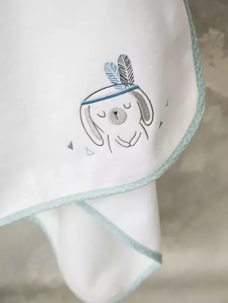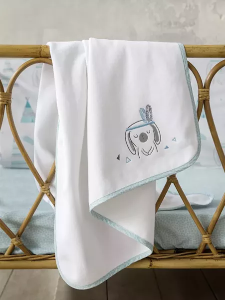 Η βρεφική κουβέρτα little indian έχει πανέμορφο κεντητό σχέδιο με κουνελάκι-ινδιανάκι, σε γλυκιές αποχρώσεις του πράσινου – βεραμάν επάνω σε λευκή βάση. Το χρώμα της γαλήνης και της ηρεμίας σε συνδυασμό με ένα σχέδιο που μοιάζει με μοντέρνα εικονογράφηση παραμυθιού, θα μεταμορφώσει το βρεφικό δωμάτιο σε έναν χώρο ιδανικό για τον ύπνο και τη χαλάρωση του μωρού σας. Το μωράκι σας μπορεί να κοιμάται ήσυχο παρέα με το κουνελάκι-ινδιανάκι που θα συντροφεύει τα όνειρά του και τις ώρες παιχνιδιού. Συνδυάστε τη με το αντίστοιχο σετ κούνιας για ένα όμορφο αισθητικό αποτέλεσμα.