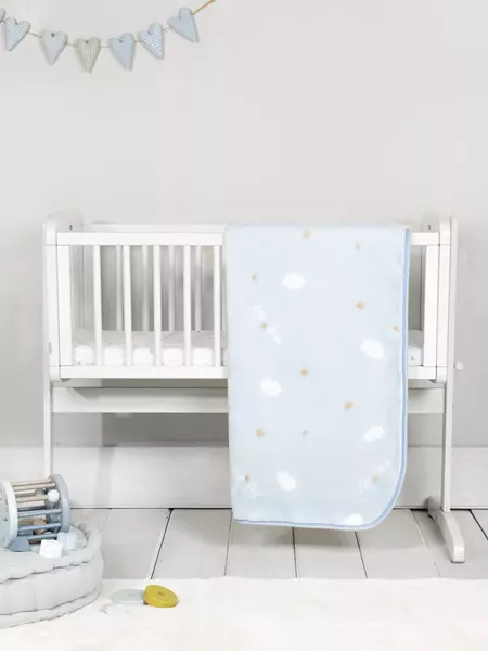 Η βελουτέ κουβέρτα κούνιας joy ride έχει σχέδιο που απεικονίζει έναν ήρεμο, γαλάζιο ουρανό, με διάσπαρτα απαλά λευκά σύννεφα και λαμπερά αστέρια. Στο κέντρο της κουβέρτας, η λέξη "joy" με μια κομψή καλλιγραφική γραμματοσειρά, προσθέτει μια αίσθηση τρυφερότητας και αισιοδοξίας. Η κουβέρτα ολοκληρώνεται με μια κλασική καρό μπορντούρα σε αποχρώσεις του γαλάζιου και του λευκού, η οποία πλαισιώνει το σχέδιο και προσδίδει μια παιχνιδιάρικη πινελιά. Η κουβερτούλα λίκνου έχει πιό λιτό αλλά το ίδιο ευχάριστο σχέδιο, καθώς απεικονίζει έναν γαλάζιο ουρανό με λευκά συννεφάκια και χρυσά αστεράκια. Ο συνδυασμός χρωμάτων και σχεδίων προσφέρει ένα κομψό και ταυτόχρονα παιδικό αποτέλεσμα, ιδανικό για κάθε βρεφικό δωμάτιο.