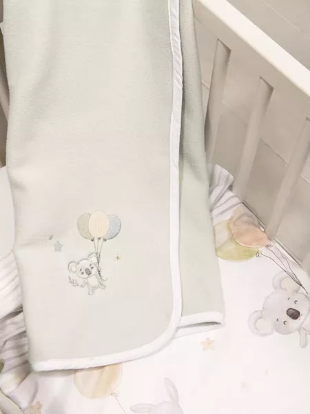 Η βρεφική κουβέρτα jouer έχει ανοικτό γκρι χρώμα και είναι κεντημένη με ένα τρυφερό σχέδιο με κοάλα αγκαλιά με χρωματιστά μπαλονάκια. Έχει περιμετρικό τελείωμα με διακριτικό βαμβακερό ρέλι και οι γωνίες της είναι στρογγυλεμένες ώστε να μην ενοχλούν την ευαίσθητη επιδερμίδα του μωρού σας. Είναι ίδανική για να προσφέρει τη γλυκιά ζεστασιά και την χαλάρωση που είναι απαραίτητη για ένα ήσυχο ύπνο. Συνδυάστε τη με ασορτί σεντόνια και πάντα για να δημιουργήσετε αρμονία στο βρεφικό δωμάτιο και να δώσετε έναν αέρα παραμυθένιας μαγείας.